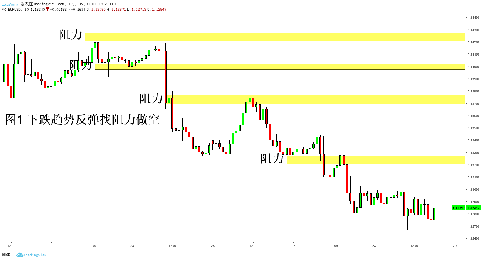 如图1在这段EURUSD(欧元兑美元)的下跌行情中,倾向于反弹找阻力做空,结果就像图2里看到阻力,单子做进去就被止损,连续止损了两次,可能第三次都不敢再空,结果行情反转了。