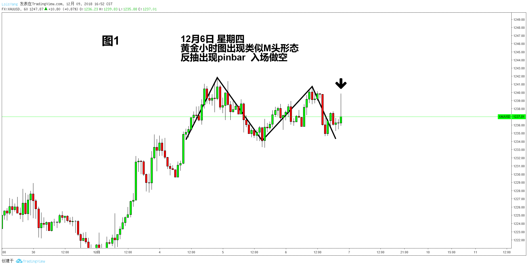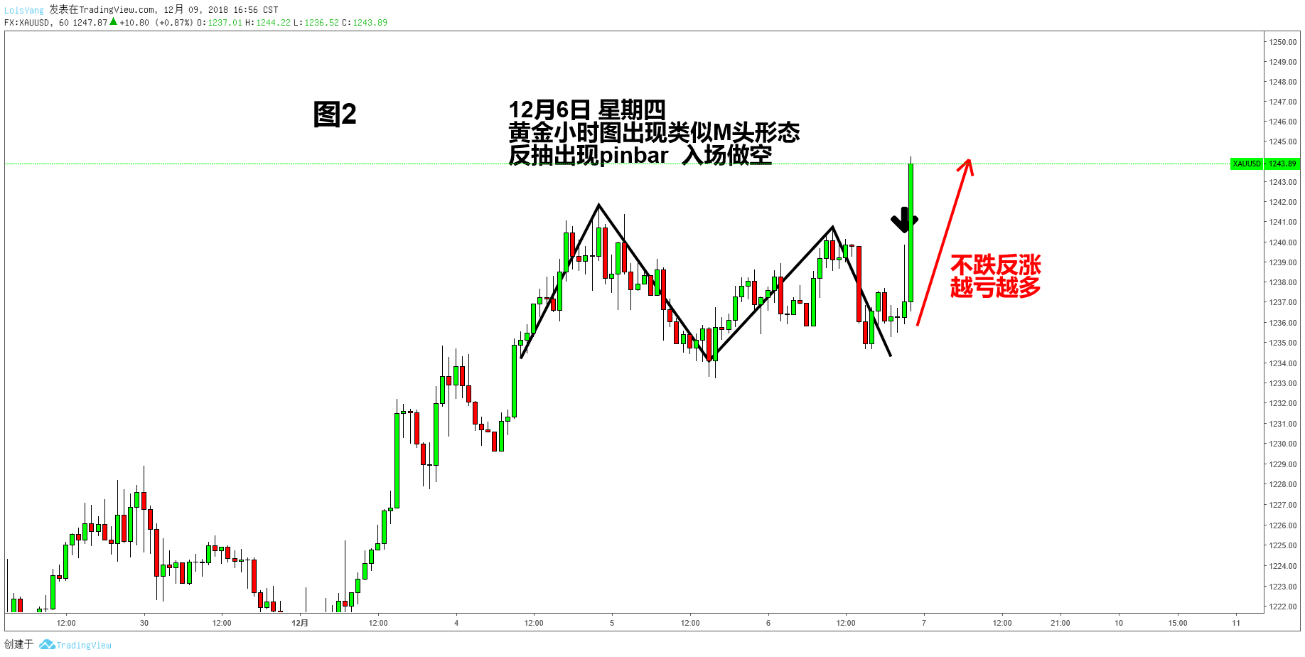 比如图1中,2018年12月6日星期四黄金小时图出现了类似M头形态,反抽出现pinbar,入场做空,结果行情如图2,以为稳稳下跌的行情反而强势上涨,越亏越多。