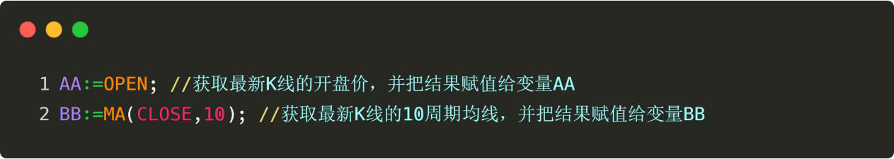 例:AA:=OPEN; 获取最新K线的开盘价,并把结果赋值给AA