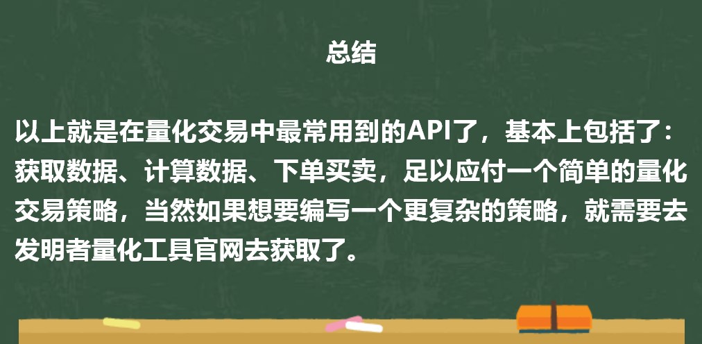 可能有些小伙伴会有疑问,上面这么多API,怎么记住呢?其实这些都不用你死记硬背,发明者量化官方有一套详尽的API文档。就像查字典一样,当你用的时候,需要什么直接查就行了。不必被代码等初次认识的内容吓住,我们要的是通过这些语言去组织自己的策略,请大家记住,技术永远不是量化的门槛,是否拥有好的策略才是你能否在量化市场走的长远的关键。