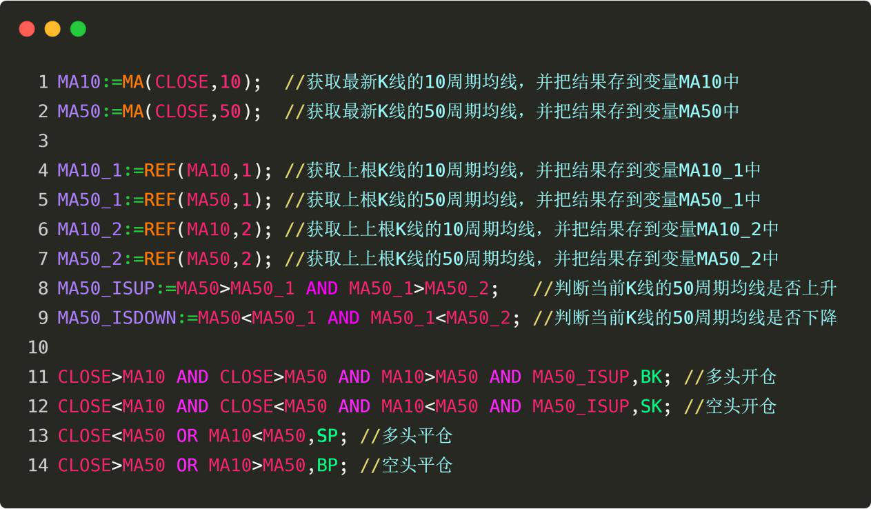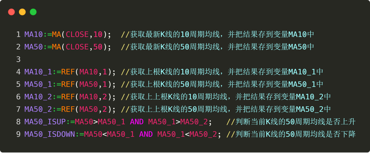 在手工交易中,我们能一眼看出50周期均线是上升的还是下降的,但是我们怎么用代码表示?仔细想想,判断均线上升不就是,当前K线的50周期均线数值比上根K线的50周期均线值大,并且上根K线的50周期均线数值比上上根K线的50周期均线值大吗?反之就是判断均线下降。那么用代码表示,它应该是这样的: