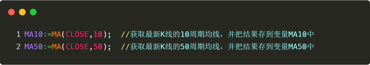 然后是计算指标,在这个量化交易策略中,我们一共用到了2个技术,即:短期均线和长期均线,我们假设短期均线为10周期均线,长期均线为50周期均线,那么怎么用代码表示10周期均线和50周期均线呢?请看下图: