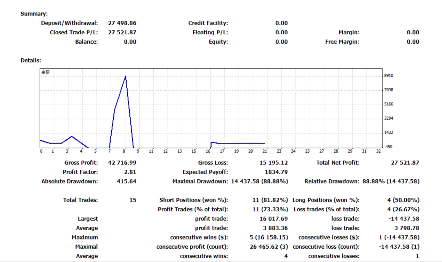 他用500美金进场,做的品种包括黄金、白银和美日。虽然出师不利,第一把博弈就输了,亏损后剩下80美金,但最高到8万多,出金总计2.8万美金。